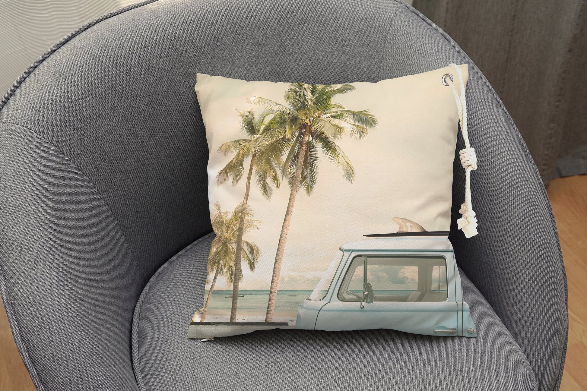 Besonderes Highlight: Die Kissenhülle ist mit einer markanten Öse und einer dicken Stoff-Kordel ausgestattet, was ihr einen maritimen und hochwertigen Look verleiht.